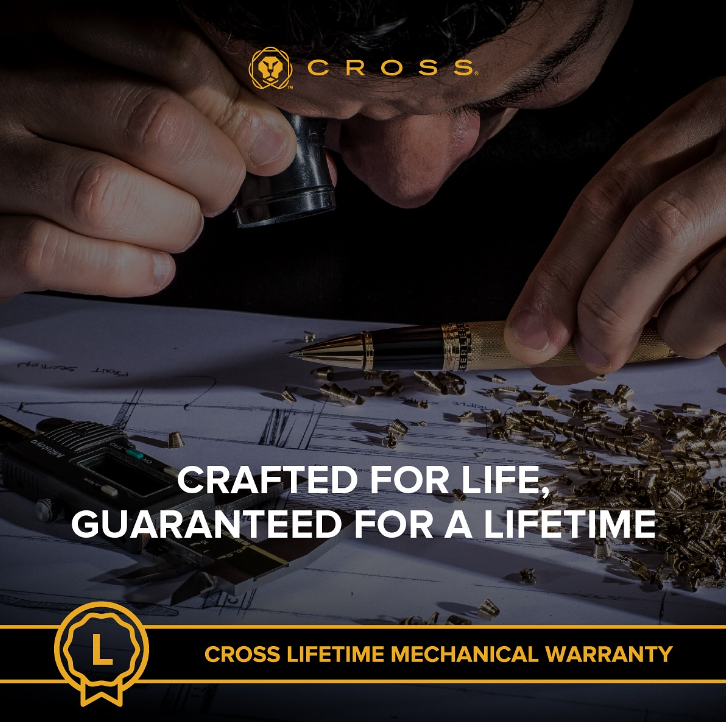 We take personal pride in our products and your satisfaction is our primary concern. To uphold the trust you place in us, Cross products are unquestionably guaranteed against mechanical failure. Writing Instruments are backed by a Lifetime Mechanical Warranty. Cross branded leather accessories and journals are backed by a One-Year Warranty.